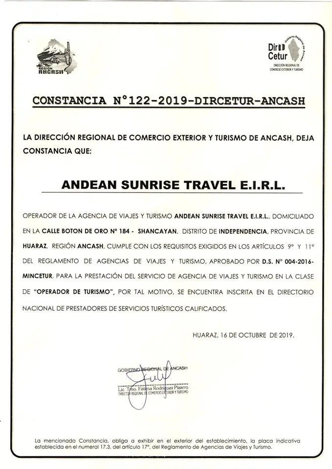 Andean Sunrise es una empresa local especialistas en la organización de viajes a medida en Peru; Lima, Cusco y Huaraz (Cordillera Blanca y Huayhuash); contamos con un grupo de trabajadores capacitados y con certificación, siempre dispuesto a brindarle un servicio personalizado.